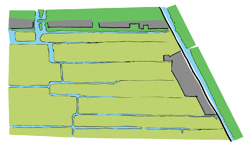 De agrarische verkaveling dient als basis voor de structuur van de buurt. De landbouwsloten verbreden we om deze structuur te versterken en de mogelijkheden voor kano’s en kleine bootjes te verbeteren. De sloten kunnen in de toekomst aansluiten op de waterstructuur uit de plannen voor Groenewoud. Daarmee worden de Kortenhoefse plassen in de toekomst bereikbaar. Het slotenpatroon wordt voor een groot deel behouden en deels aangepast naar een stramien voor de verkaveling van de toekomstige buurt. Binnen de rode contour maken we een vrij compacte woonbuurt (ca. 27 woningen per ha) en buiten de rode contour komt een schil van landschappelijk groen. De landschapsstructuur wordt met natuuroevers en landelijke beplantingen